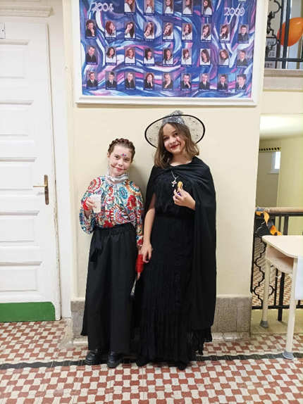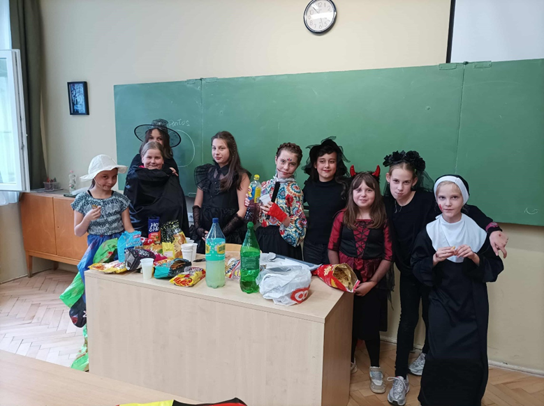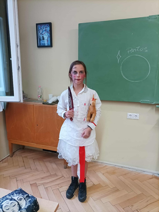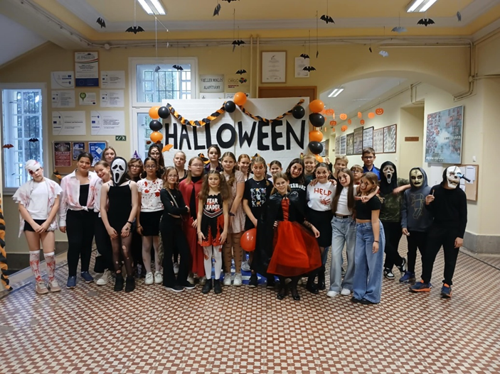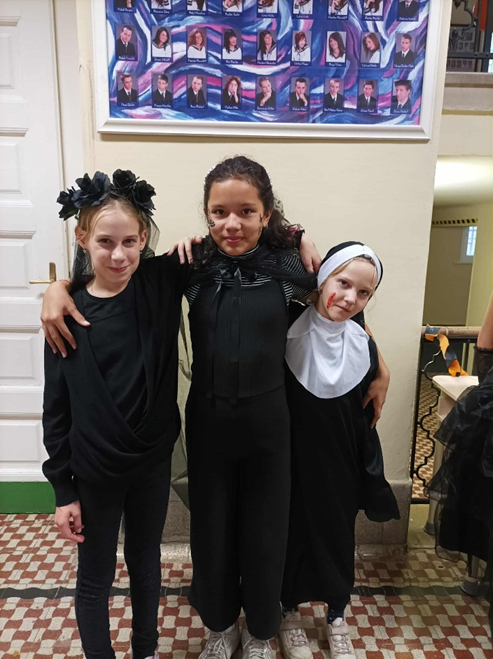 Idén 6. osztályosként, már másodszor vehettem részt a halloweeni bulin. Az őszi szünet előtti utolsó napokban az iskola falai közé is megérkezett a halloweeni őrület. A tanárok és a diákok már napok óta készültek erre a napra, feldíszítették a termeket és a klubbot, ahol este megkezdődhetett az önfeledt buli. A jelmezek idén is fantasztikusak voltak: boszik, csontvázak lepték el az épületet. A csillámtetkó hatalmas sikert aratott, mindenki kedvére csilloghatott. A hangulat fantasztikus volt mindenki sokat nevetett, táncolt. Az este nem a félelemkeltésről szólt, hanem a vidámságról, a viccelődésről, és arról, hogy mindenki szívinfarktus nélkül jól érezhesse magát. Persze a sötét folyosókon jó volt bújócskázni, egymást megijeszteni, de ezen is mindenki jól szórakozott. A jósda pedig mindenkinek csupa jó dolgot ígért a jövőre. Csupa ötöst a tanév végére…